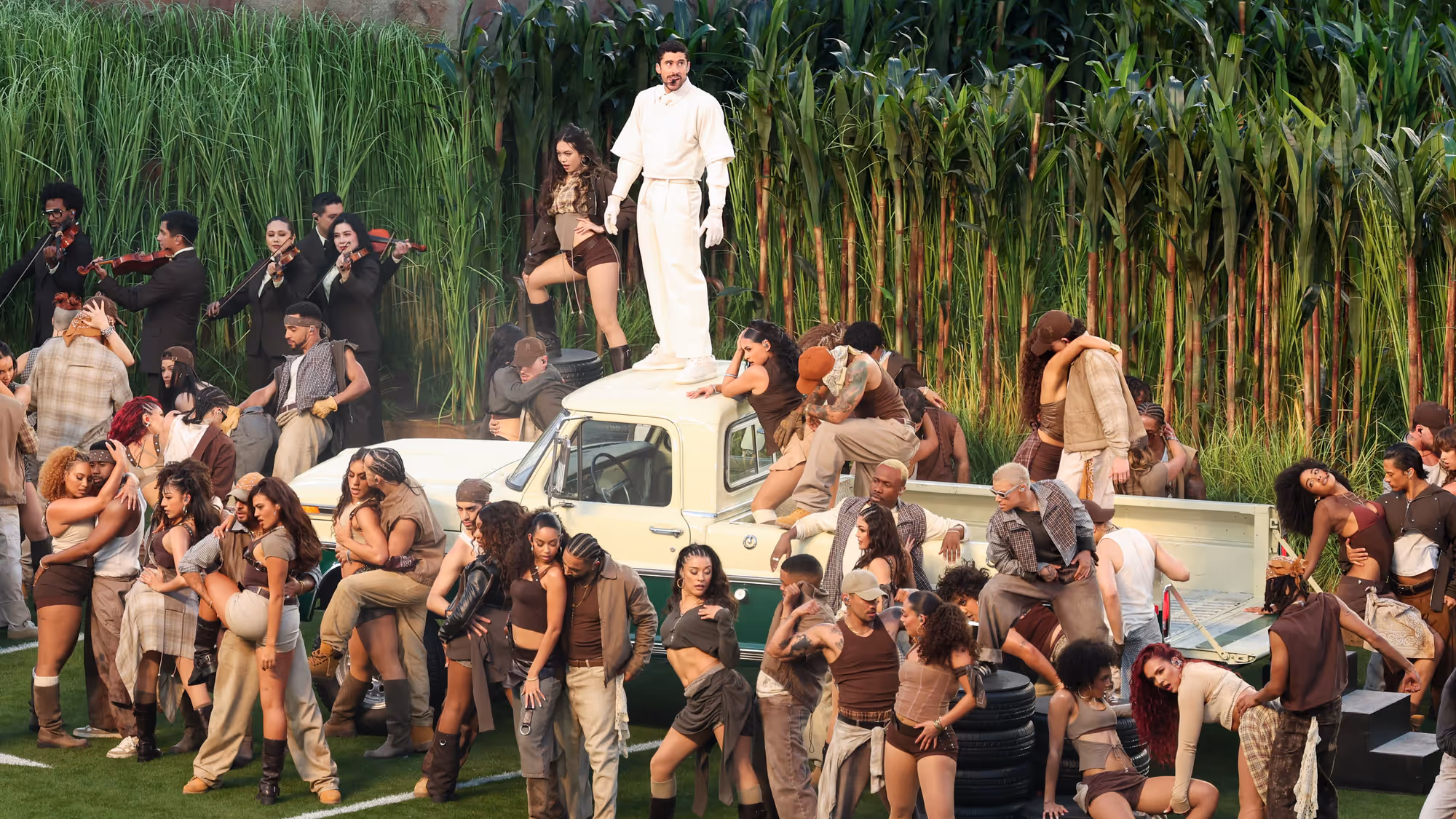 The show opened in the sugarcane fields of Puerto Rico, a deliberate and loaded visual choice. Cane fields are not simply agricultural backdrops; they are symbols of labor, colonization, survival, and generational endurance. As the performance transitioned from the fields to the football stadium—complete with cane-field props and imagery reminiscent of sharecroppers—the message was unmistakable: this culture did not arrive here by accident. It was built, worked, and carried forward.